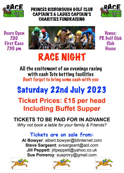 We are continuing to organise some more fundraising events for the Captains & Ladies Captains charities (MS Society & MND Society respectively) and the next event is a RACENIGHT on Saturday 22nd July 2023. I attach a copy of the poster for this event, about which we will be specifically communicating with you again.
