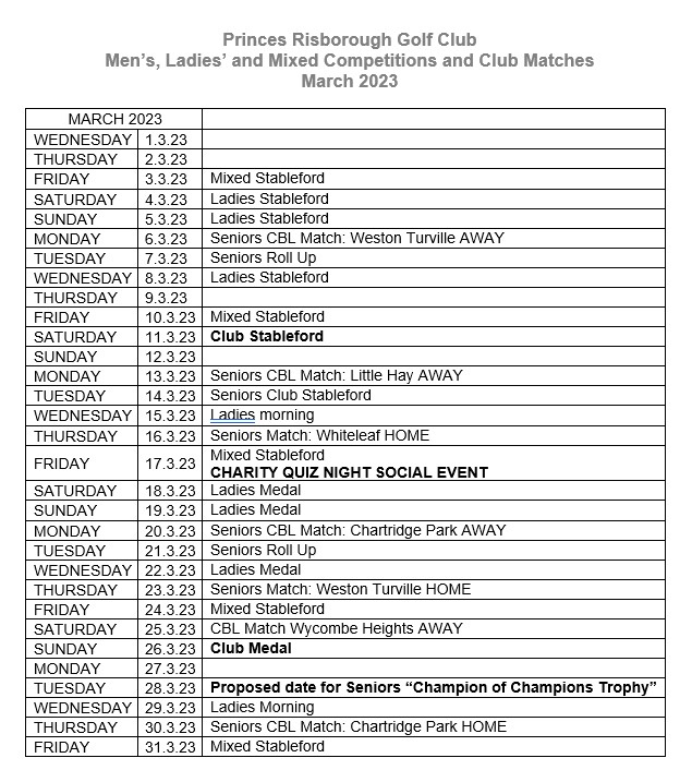 I attach the current MARCH 2023 Club Calendar. As you will see March is a very busy month with the re-start of Senior CBL matches and the start of the Seniors friendly matches together with the main club CBL matches starting on 25th March, as well as of course all the ongoing men’s club competitions, and the ladies events.