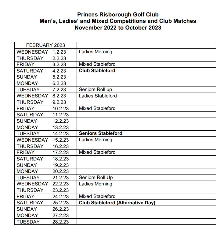 I attach the current February 2023 Club Diary.  As usual If you wish to play in any of the competitions then please simply follow the normal process for entry.