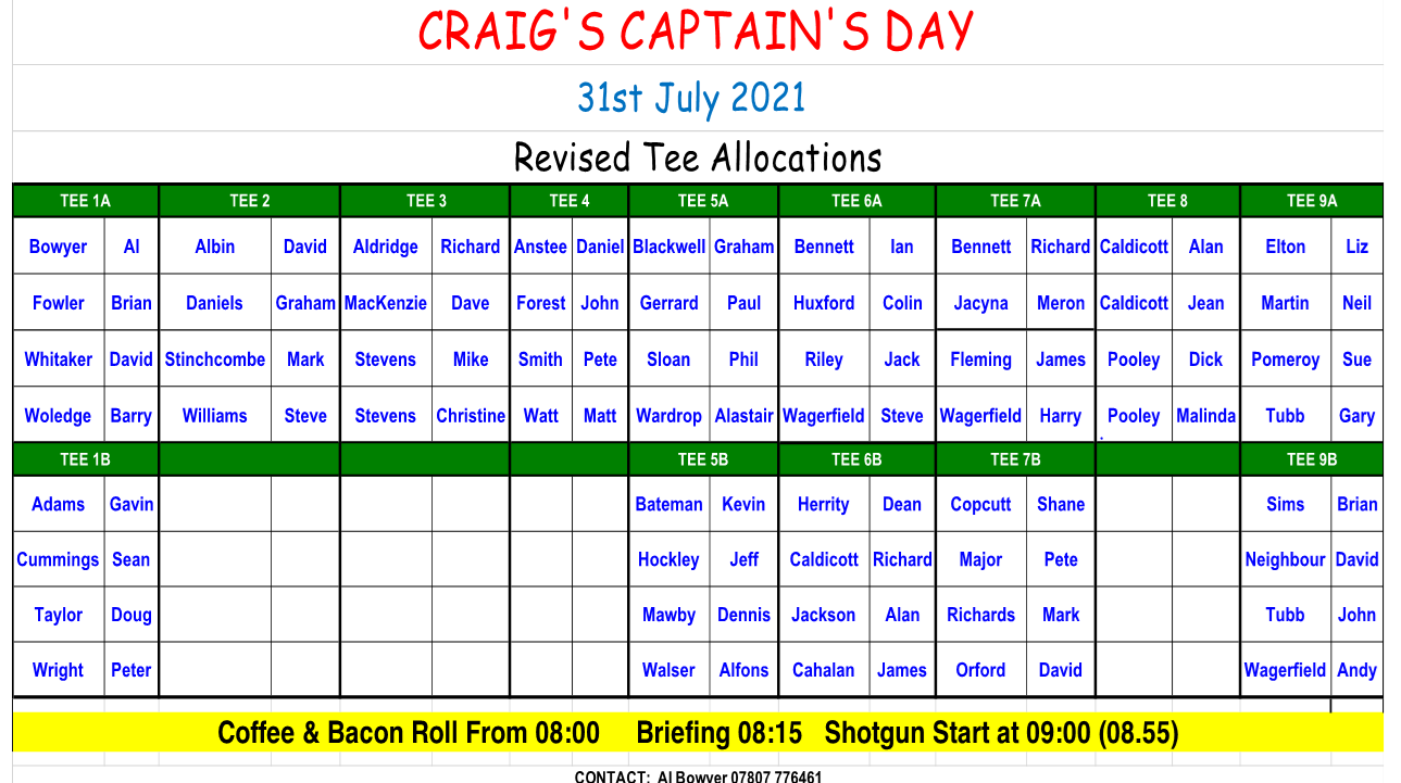 Please find attached the detailed tees and draw for CRAIG’S CAPTAIN’S DAY on Saturday.