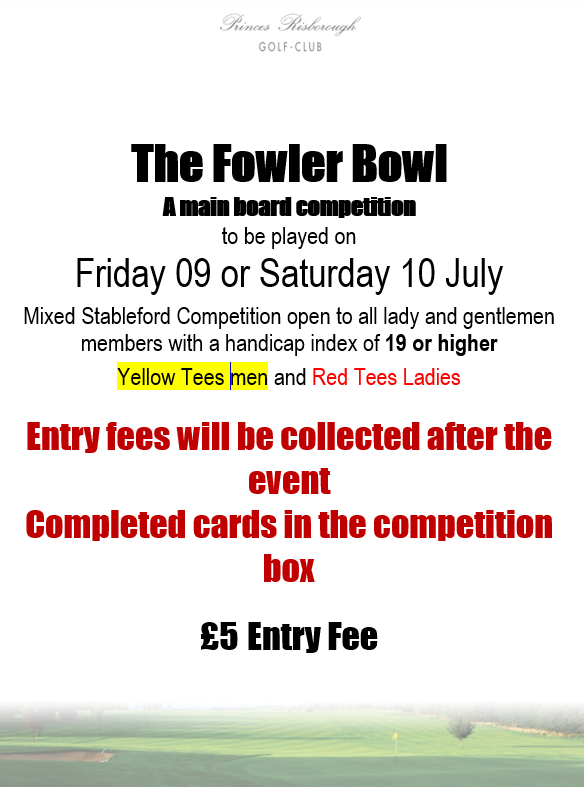 This coming Friday and Saturday we will be playing The Fowler Bowl which is the only board competition dedicated to our higher handicappers and sponsored by our past double Captain and now club Ambassador, Brian Fowler. No doubt Jack Riley the current champion will be all out to retain his status for another year!