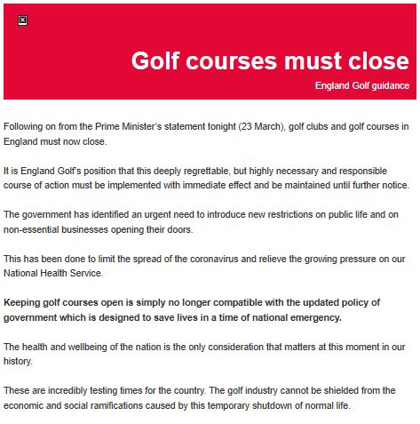 GOLF ENGLAND CLOSES ALL GOLF COURSES IN THE UK