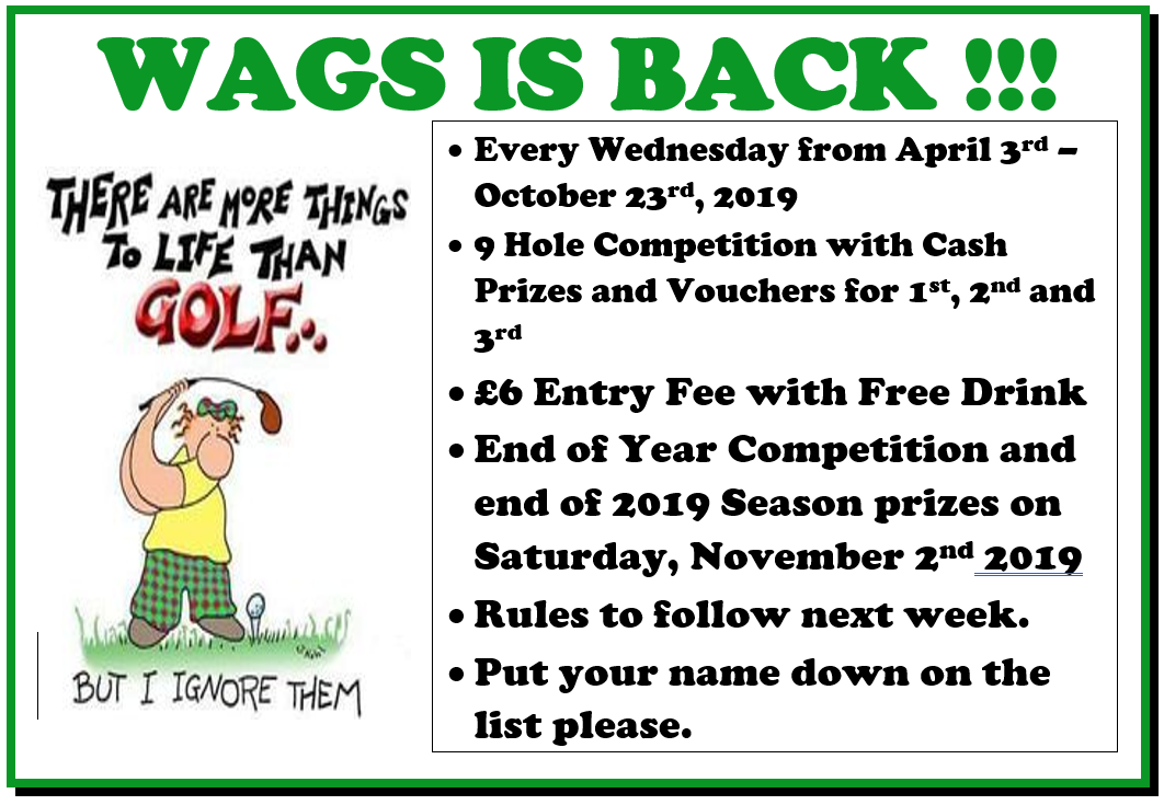 In all friendly golf we will apply a new rule. In this case if you find you have indeed hit a shot OB or your ball is lost in general play you can take a drop, two clubs lengths inside the course at the point nearest to where the ball was lost. Players should agree with their playing partners where the nearest point would be. In taking this relief you incur a two shot penalty: thus if you lose your tee shot, you drop two shots and will then be playing 4 from the nearest point to where the original ball was lost. The Committee has agreed that Friendly Golf will include the WAGS and TOFFS, the two formalised midweek friendly playing competitions at the club and all other friendly golf including Visitors and Societies.