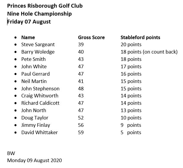 The winner with an outstanding 20 points is Steve Sargeant. Literally hot on his heels (well OK, not quite) were myself and Pete Smith on 18 points. Steve will get his name on the 9 hole championship board along with the past winners Mark Tubb and Paul Gerrard. Before that can happen I have to recover the board from Mick the Trophy man where it has been held since lock down so that may take a while yet!!